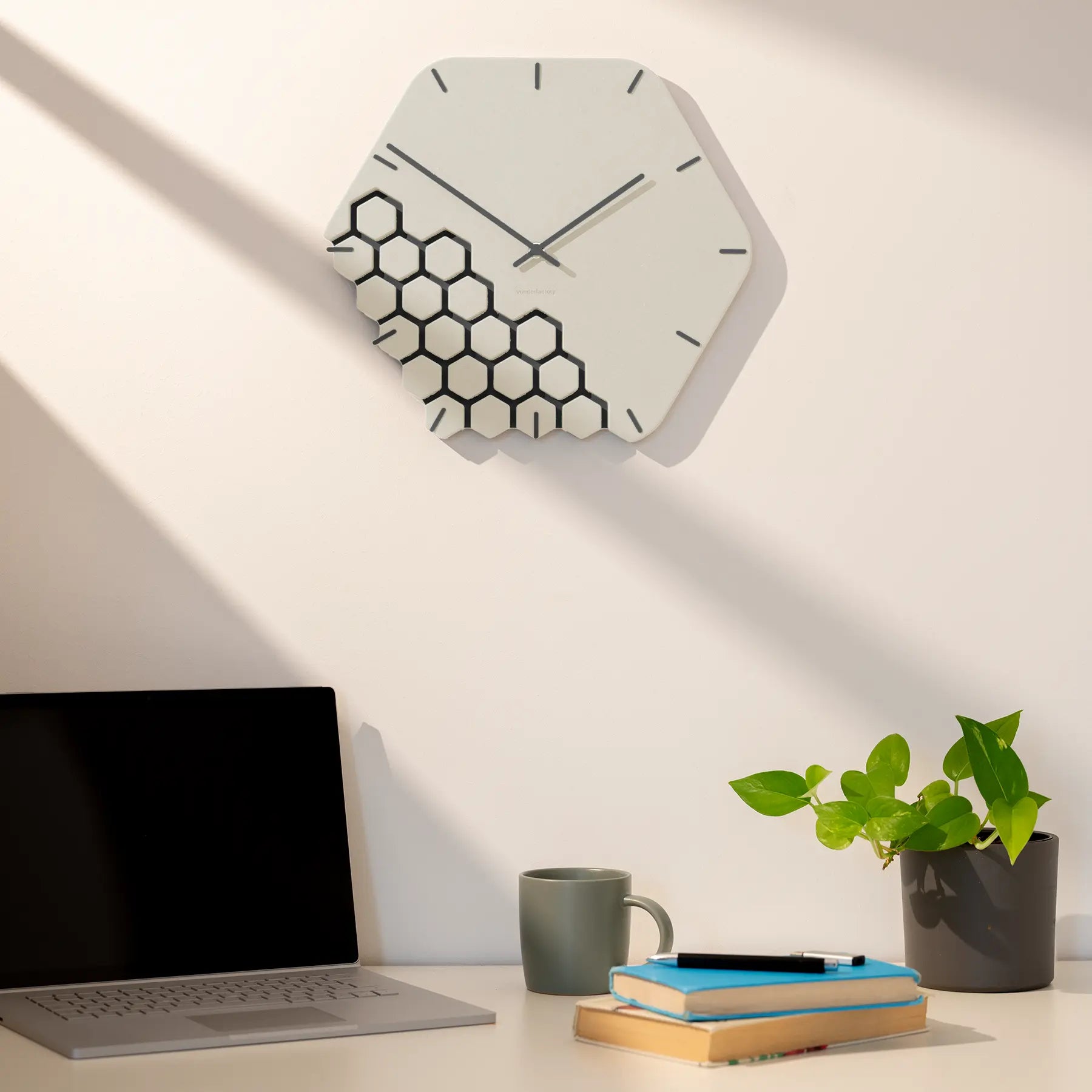 - Striking hexagonal shape with a dynamic, fragmented honeycomb pattern