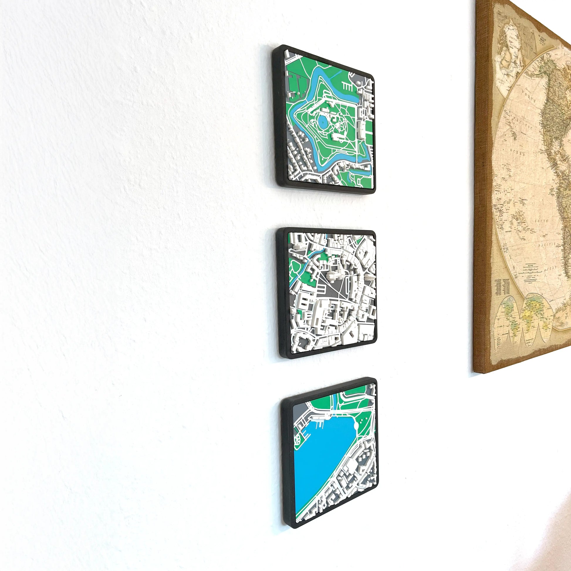 Alle drei Stadtmodelle basieren auf individuell entwickelten 3D-Daten – keine generischen Vorlagen. In unserer Manufaktur in Münster wird jedes Motiv mit Sorgfalt modelliert, aus nachhaltigem PLA im 3D-Druckverfahren hergestellt und anschließend von Hand veredelt. Die schwarzen Valchromat Holzsockel mit integrierter Wandhalterung unterstreichen die Wertigkeit und machen das Set flexibel einsetzbar.
